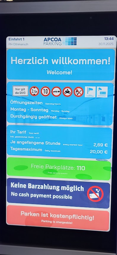 Ihr kennt alle die unglückliche Parksituation in Othmarschen und ich möchte allen, die genauso wie ich gestern, Samstag, 29.11.2025 im Parkhaus parken mussten, meine Parkgebühren offen legen. Ich bin um 08:52 Uhr in das Parkhaus gefahren und angezeigt wurde mit 2,30 Euro pro Stunde. Als ich um 12:36 Uhr bezahlte, zeigte Automat 9,56 Euro an und ich wunderte mich über den krummen Betrag. Da dabei nicht die einzelnen Stundenpreise angezeigt wurden, bezahlte ich erst einmal und ließ mir eine Quittung ausdrucken. Auf dem Display an der Einfahrt wurde 2,69 Euro angezeigt.